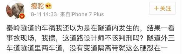原因是,在2017年的事故中,虽然与驾驶员疲劳驾驶有关,但当时曾参与高速工程建设的市政道路工程监理雷先生直言,秦岭一号隧道入口设计不合理:道路为三车道,隧道为两车道,本应提前缩小,却没有缩小,形成了“断道”。当时也有人质疑以下问题(如下图):