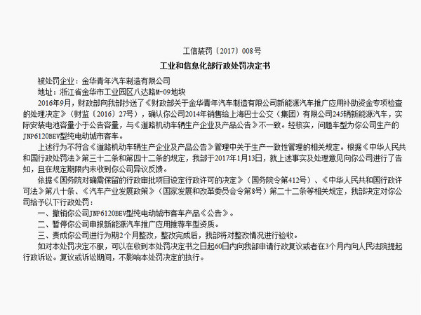 而金华青年汽车制造有限公司则是在2014年销售给上海巴士公交(集团)有限公司的245辆新能源汽车,实际安装电池容量小于公告容量。涉及车辆为JNP6120BEV型纯电动城市客车。