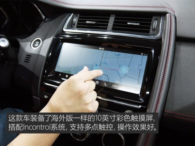 E-PACE的内饰采用了捷豹家族式设计,造型与F-TYPE相似度较高。中控台部分区域采用皮革材质包裹。海外版的全液晶仪表盘并未在国产车型中出现,其采用的是相对传统的造型设计。中控区装配有10英寸的彩色触控屏。