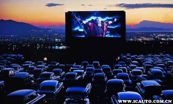 观众坐在车内通过调频收听观看露天电影,利用停车场作为电影放映场地,让车内观众在不同位置看到清晰、逼真、稳定的图像,再通过调频信号将声音引入车内,让观众坐在车内观看电影。