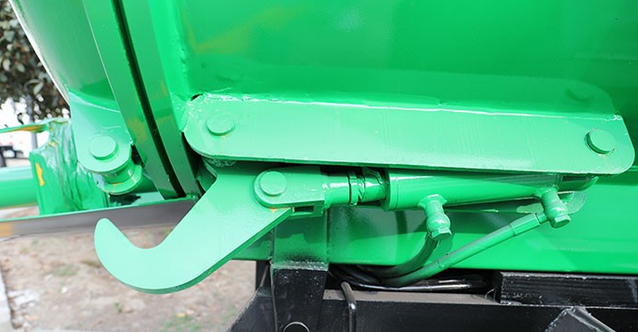 罐体后门与罐体之间还装有液压缸锁紧钩,该装置锁紧时可使罐体达到密封状态,避免二次污染;该装置松开时,可以打开罐体后门,倾卸垃圾。