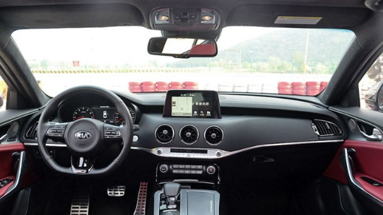 斯汀格GT+内饰并不像外观那样的惊艳,三圆形的中央出风口和矗立的屏幕有点奔驰车风格了,红黑色色调的搭配营造出了一定的运动感。